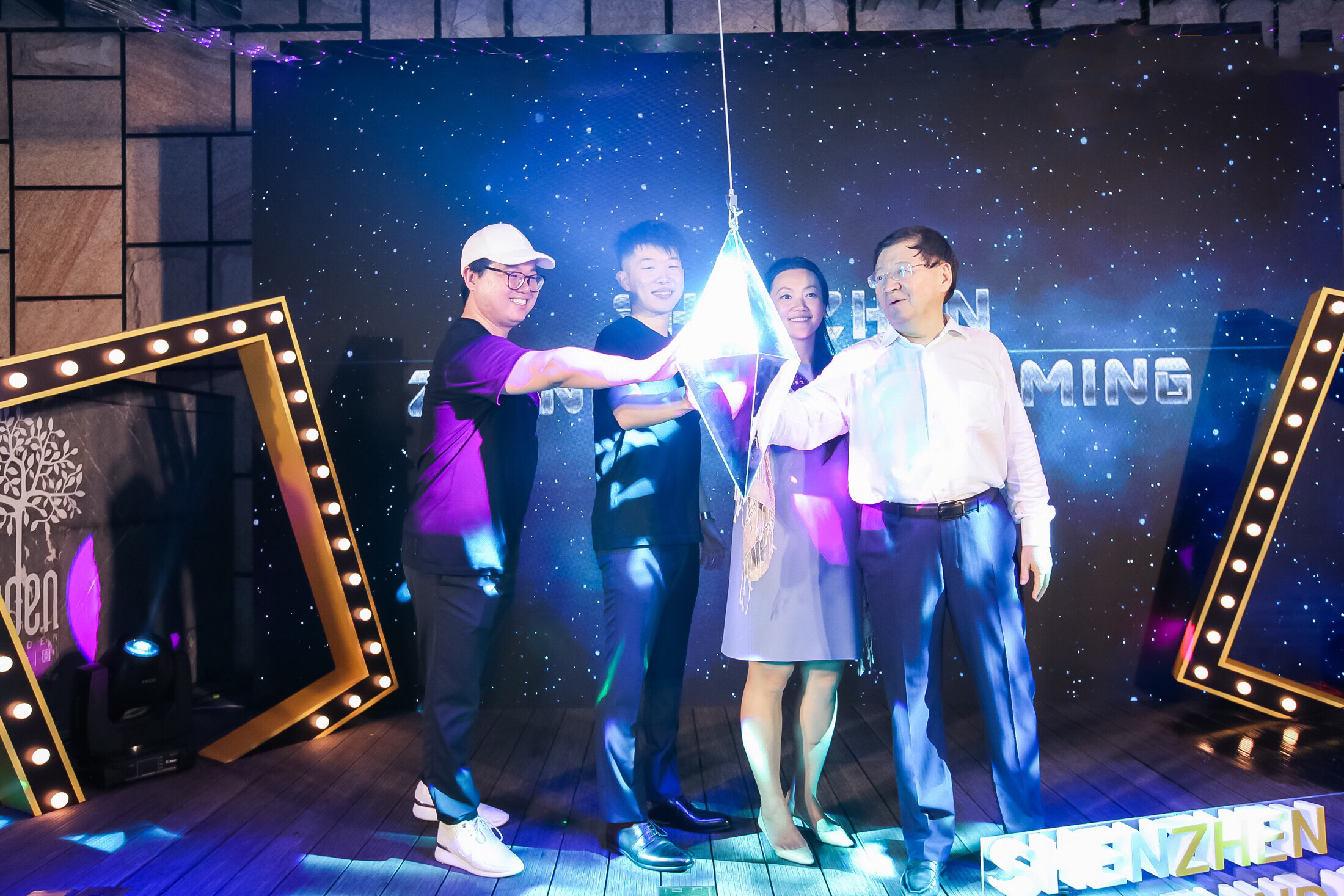 真格深圳办公室开幕式上。从左至右为完美日记创始人黄锦峰、真格基金关山行、方爱之、徐小平