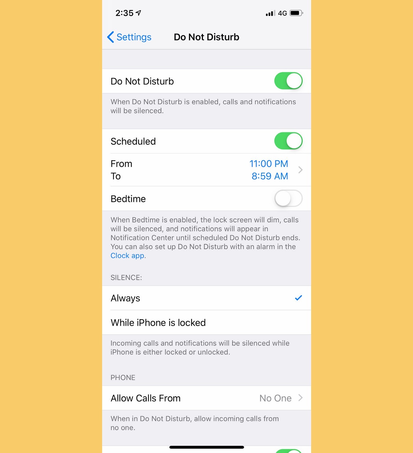 要做到这一点,点击设置>勿扰模式,启用它。然后向下滚动,确保在“静音”栏下选中“始终”。你也可以设定时间——例如,在工作时间端内不要被打扰。你还可以在控制中心内打开或关闭它,它的图标是一弯新月。