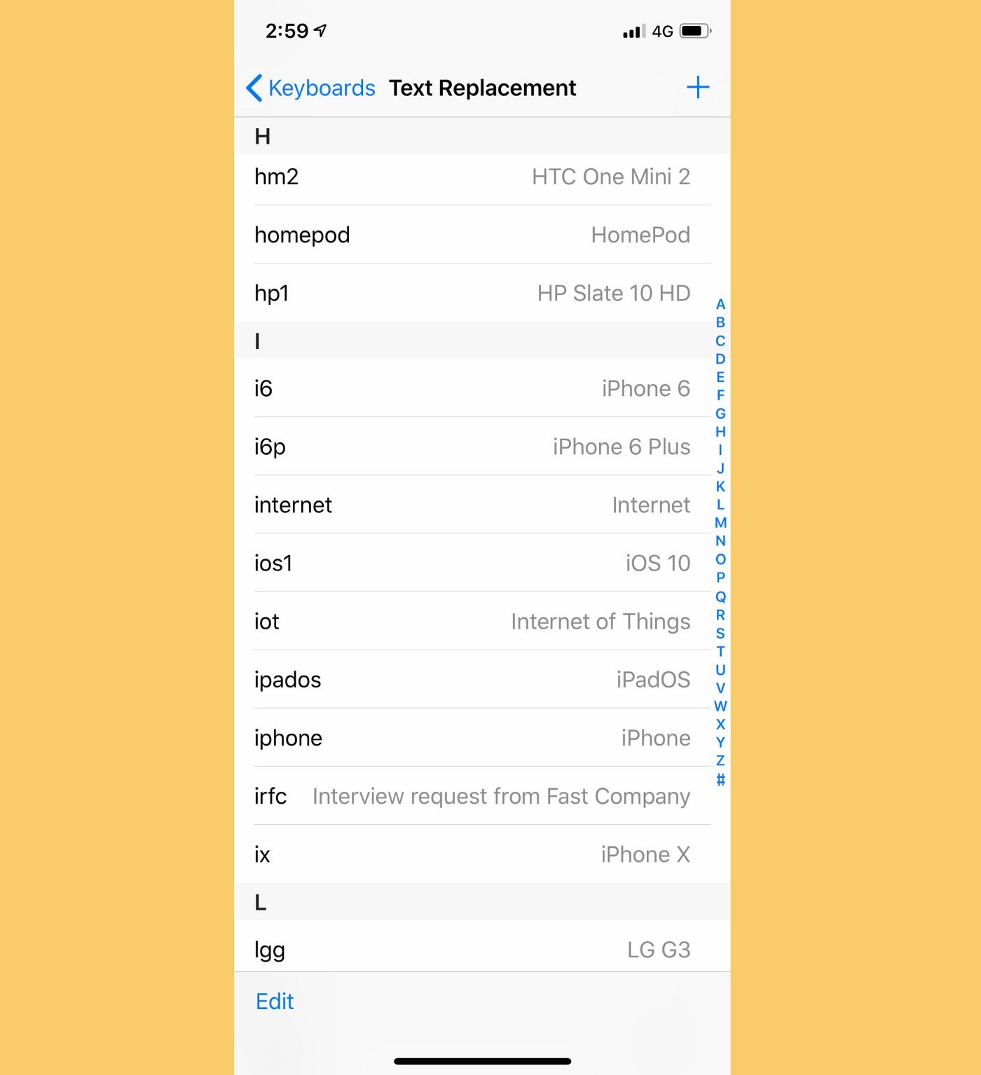 例如,有一段时间我写了很多关于全面屏(edge-to-edge)设备的文章。你看“edge-to-edge”这个词,它需要连字符,在iPhone上输入这个短语,我需要进行无数次切换,输入速度慢得令人恼火。所以我为它创建了文本替换。现在,每当我输入“e2e”,iOS就会自动用短语“edge-to-edge”替换文本。