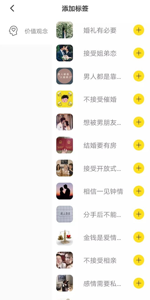 此外,平台还提供身份标签、兴趣爱好、生活方式和价值观念4个维度的标签供用户选择,比如不刷抖音、结婚可以不买房、喜欢健身等等。