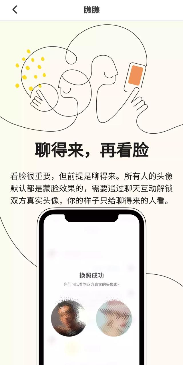 在平台上,用户的头像默认都是蒙脸效果,聊天互动达到一定标准后,才能申请解锁双方真实头像。