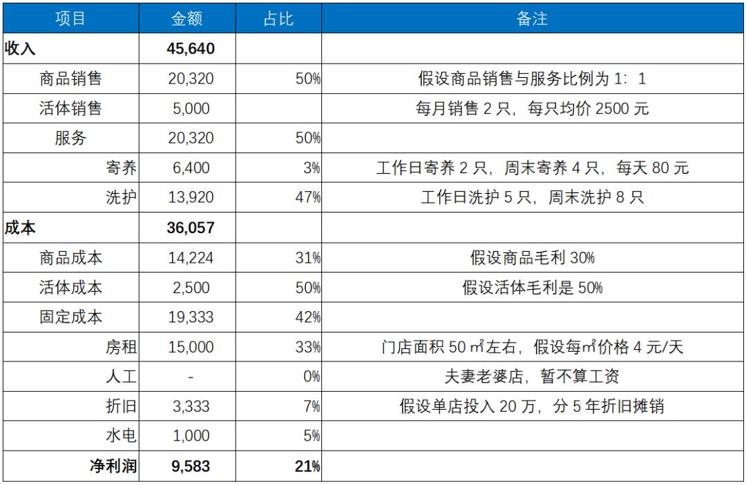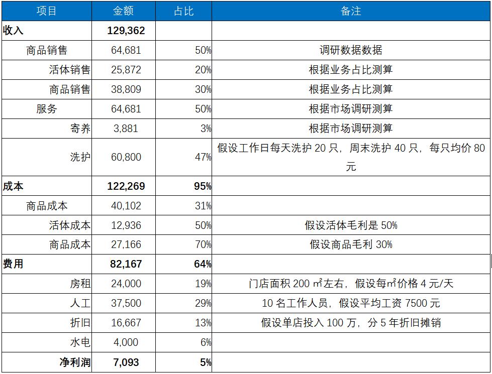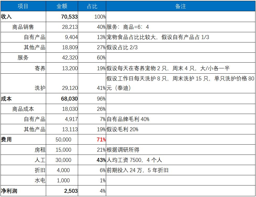 根据调研测算,小佩1个月的单店收入在7万元左右,其中服务收入占到了60%,整个门店运营费用5万元,人员工资在整个收入中占比达到了40%以上,最终算下来整个门店净利润2500元,一旦销售的商品或服务略有下降,那么整个门店将处于亏损状态。具体情况如下: