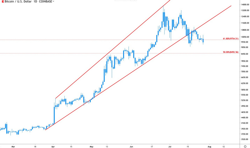 在过去的两周内,比特币在 13739 美元和 13177 美元附近形成了“双顶结构”,随后价格跌至 9600 美元颈线附近;此外,从 4000 美元开始的上升通道也已经被打破,形成看跌格局,如下所示: