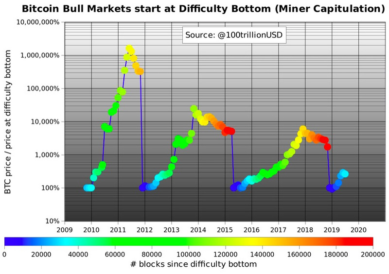 我们看到,价格在 2011 年 12 月(4.6美元)、2015 年 5 月(230美元)和 2018 年 12 月(3896美元)形成底部,彼时不少矿工投降关机。价格继续从这些底部上涨,最高收益达到 100倍的。如果上涨趋势能够持续,那从 2018 年 12 月开始的这次上涨就会达到 37 万美元。