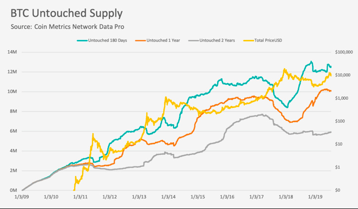 Tuur Demeester的话听起来也很有道理,但深入分析Coin Metrics图表就会发现:与较长的时间相比,180天和1年时间内的休眠的硬币数量显著增加,这一增长也与比特币价格上涨相一致。