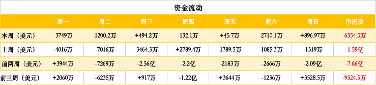 资金方面,本周资金波动较大,周一净流出资金最多,超过 3700 万美元;周日净流入资金较高,达到 800 万美元。