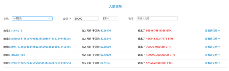“5 万 ETH 以上”转账次数共计 5 笔,环比上涨 50%。最大数额接近 47 万ETH,该笔转账为交易所 Bithumb 冷热钱包互转;另外一笔 45 万 ETH 大额转账,转出地址为富豪榜排名前三的地址,转入地址富豪榜排名第 17 名。