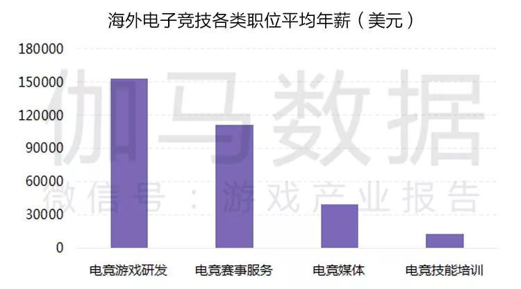 海外游戏企业能够为电竞游戏研发职位提供的薪资要高于其他职位,平均年薪超过15万美元。其次是电竞赛事服务类职位,该类职位能够获得超过11万美元的年薪。