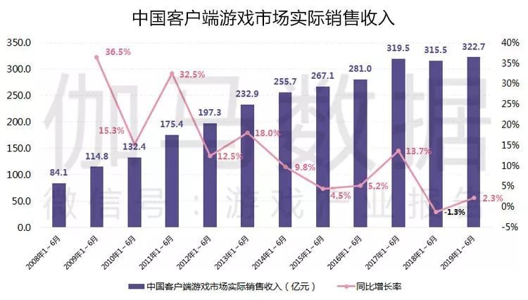 2019年1~6月,中国客户端游戏市场实际销售收入出现增长,虽然增幅有限,但相比于去年的负增长有所好转。