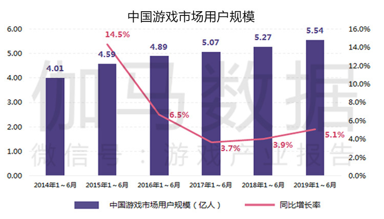 2019年1~6月,中国游戏市场用户规模约为5.54亿人,同比增长5.1%,为近三年来新高。