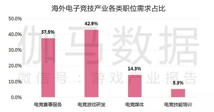 现阶段海外电子竞技产业对于人才的需求主要集中在电竞游戏研发类职位方面,电竞游戏研发类的职位需求占比达到42.9% 。其次是需求占比为37.5%的电竞赛事服务类职位。