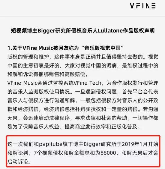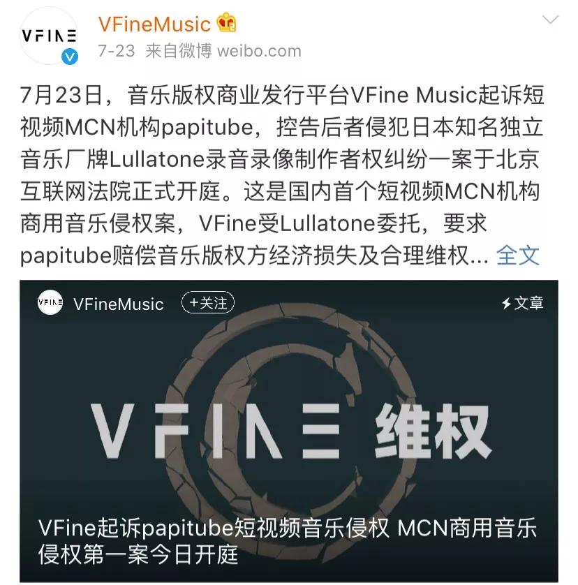 7月23日,北京互联网法院开庭审理音乐版权商业发行平台VFine Music起诉短视频MCN机构papitube一案,前者控告后者旗下自媒体账号侵犯日本独立音乐厂牌Lullatone录音录像制作者权,并要求后者赔偿经济损失等费用共计25万余元。双方在索赔金额方面不能达成共识,当庭并未宣判此案结果。