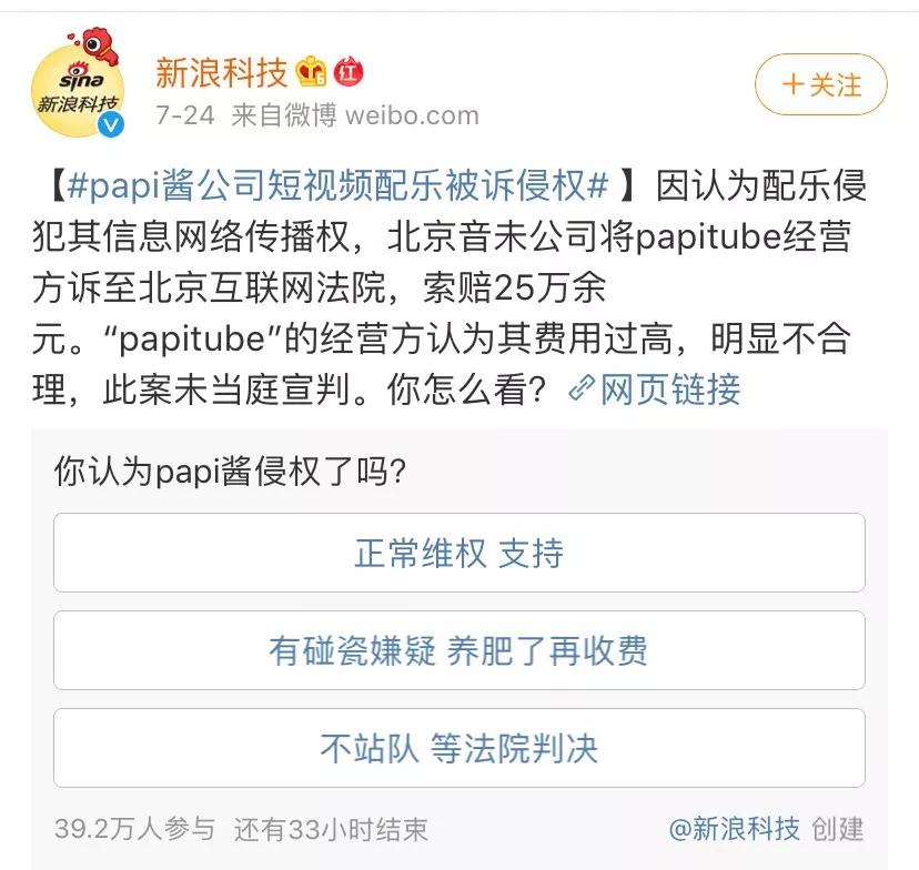 事件爆出后,“papi酱公司短视频配乐被诉侵权”攀上新浪微博热搜第一。微博账号“新浪科技”就此事发起了投票,其中15.9万人认为VFine“有碰瓷嫌疑养肥了再收费”,12.8万人表示“不站队等法院判决”,认为属于“正常维权支持”的网友则为10.2万。