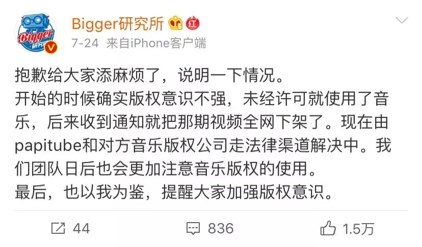 24日上午,“Bigger研究所”发布微博对此事表态,称此前版权意识不强,被诉侵权视频已下架,此事正在通过法律渠道解决,并称今后会更加注意。
