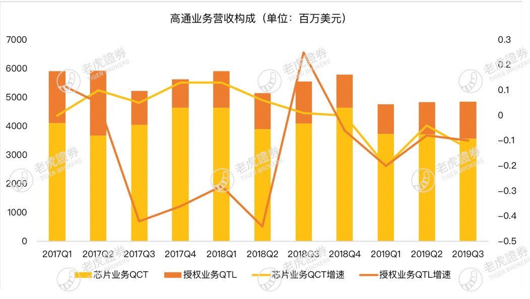 老虎证券投研团队认为,由于考虑到即将到来的5G时代,消费者更愿意延迟消费,这也导致了同期的4G智能手机下滑,进而导致与芯片专利业务相关的高通营收下滑,同时Q4业绩指引同样不及预期