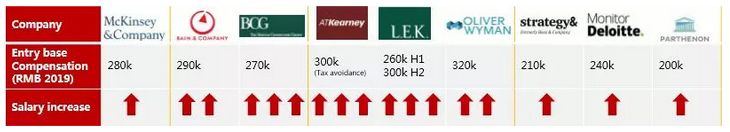 咨询行业中,Tier1-3的咨询公司都很壕气,应届生平均年薪25w-35w之间,且每年还会有5%的涨幅。