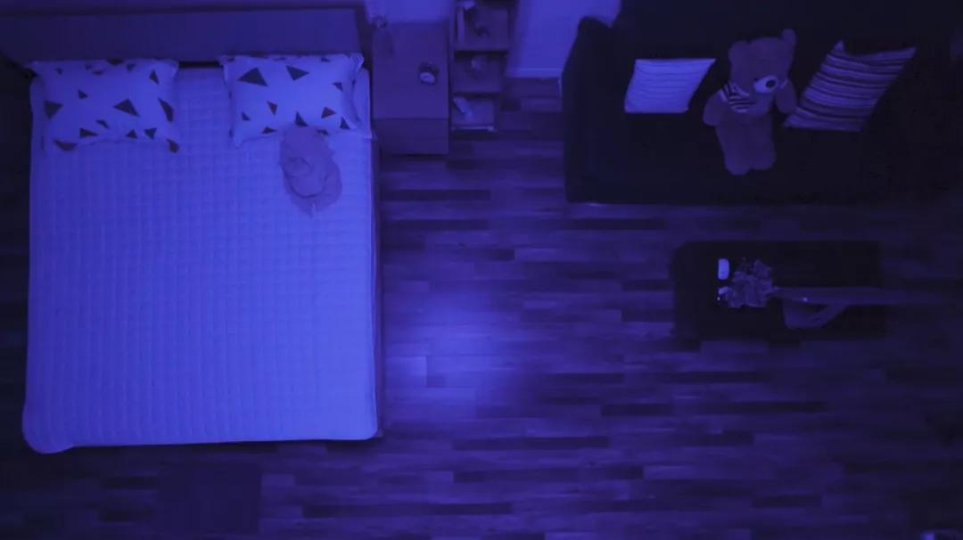 但关灯后,扮演「灰尘」的荧光粉,还是在地板缝、床褥缝和沙发缝里现出了原型。