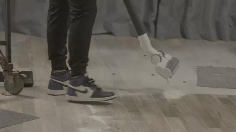 切换到站立模式后,戴森V8 Fluffy在吸地板的表现上同样非常出色,一走一过,荧光粉就全被吸进尘桶里了。