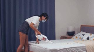 看看小张打扫房间时的认真样子,就知道这是个多么爱干净的小伙子了。床褥吸得都看不见荧光粉了,还要再仔细地吸上一遍,说是为了去除床褥下面的尘螨。