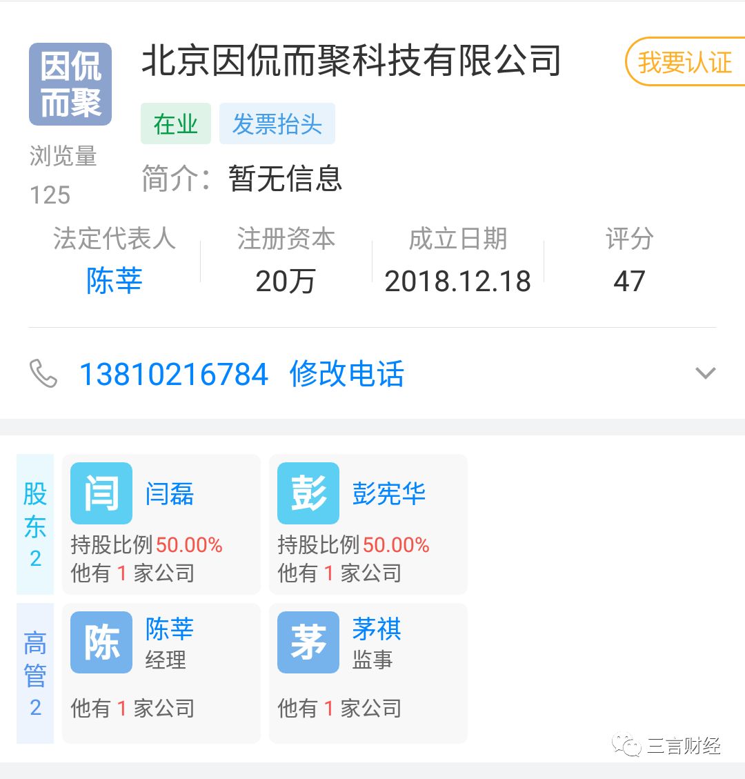 天眼查显示,北京因侃而聚科技有限公司的主要人员包括两位股东闫磊和彭宪华、法人兼经理陈莘,监事茅祺。