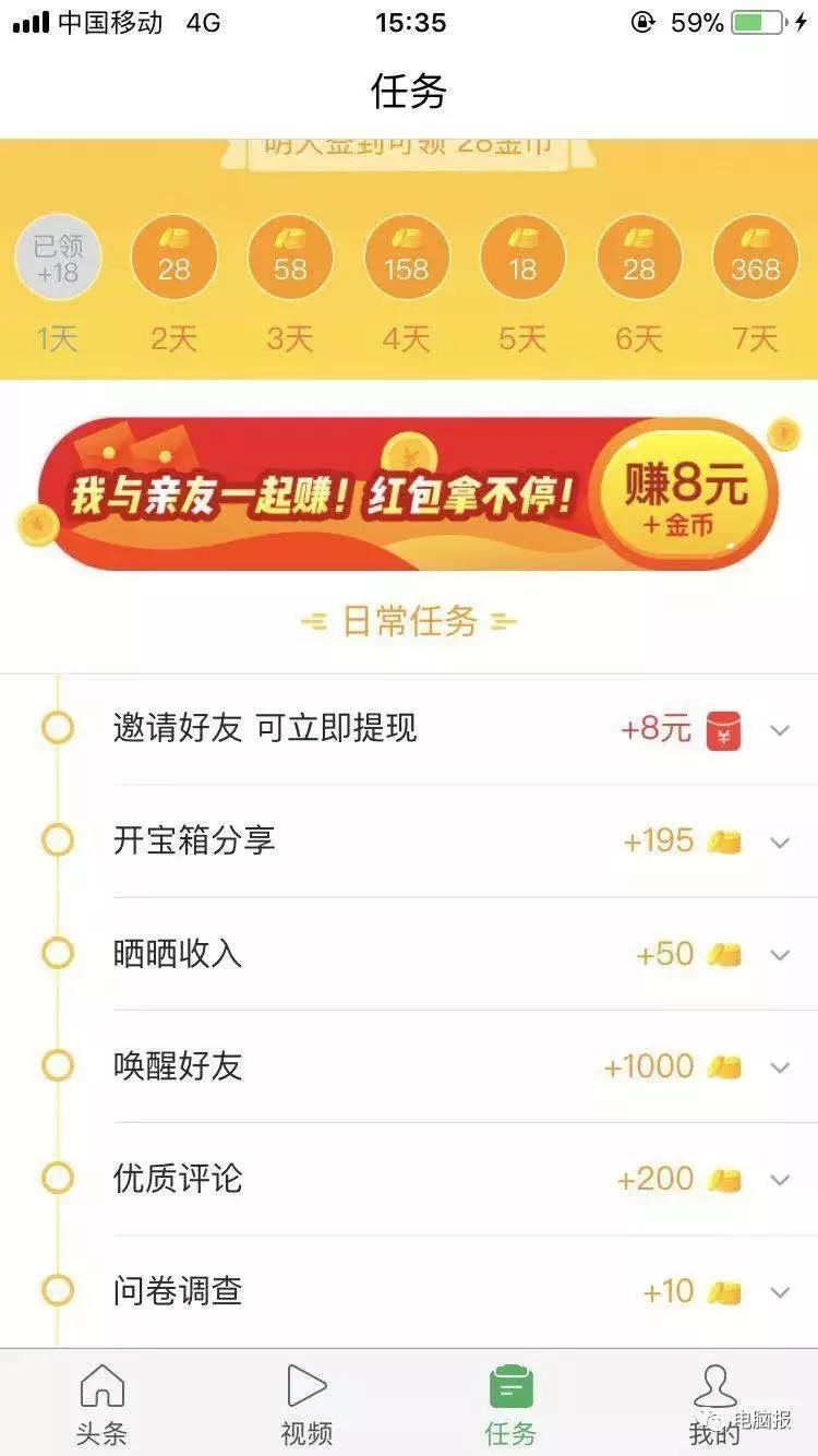 打开APP,就会收到一个新人现金红包奖励,每天在规定有效时长内浏览、评论文章等便可获得相应金币,金币在一定数量后可以置换为现金提取。但随着时间累积,金币的获取难度逐渐上涨,后期便需要借助分享和邀请好友,获得奖励。