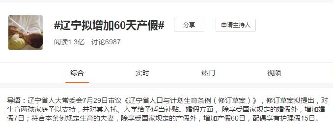#辽宁拟增加60天产假#,凭借最新出炉的二胎政策,辽宁喜提热搜,相关话题阅读量1.3个亿。