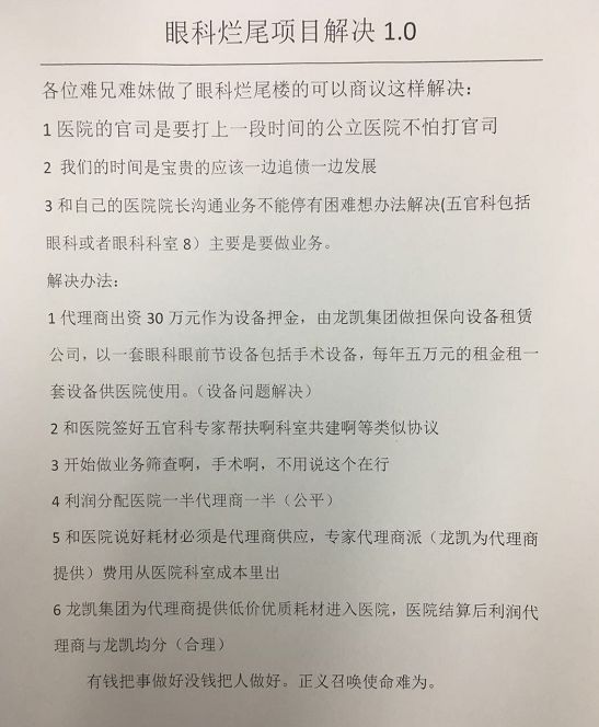 “下套第一步:话术统一,打着技术支持、慈善扶贫、专家培训、医生集团的旗号,高薪聘请当地退休官员为顾问,听起来高大上。第二步:邀请基层医院院长参会、旅游,吃吃喝喝看表演,再进行煽动性讲话,大家跃跃欲试,一半以上医院当场就能签订协议。接下来就是帮扶科室,一个科室远远不够,还会专门选择有设备买卖需求的科室。”何文称,“现在甚至有些医生集团也正在利用这种模式”。