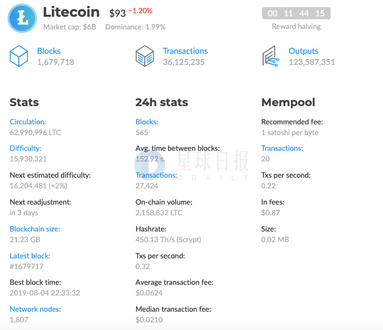 据Blockchair数据显示,LTC当前区块高度为1679718,平均出块时间为152.92 s,LTC将在区块高度1680000减半,大约剩余11小时44分。