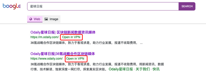 在搜索到结果后,Boogle 会将内容以两种形式呈现:一种是直接访问源网站,但会在源网站留下记录;另一种是通过 Boogle 提供的虚拟专用网络通道加密技术,匿名访问,实现隐私保护。
