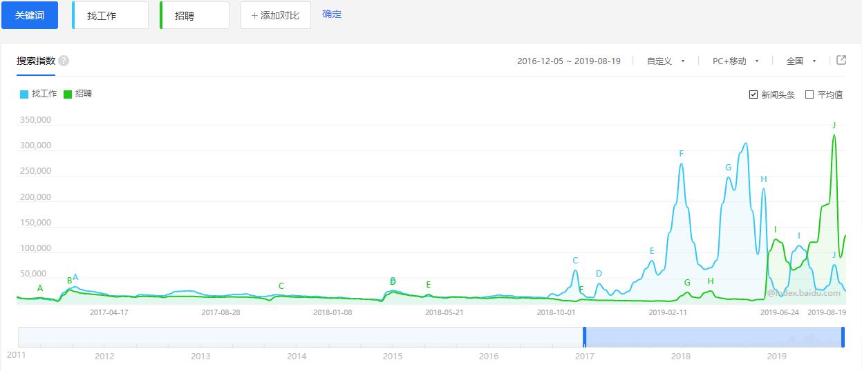 从2018年下半年以来,“找工作”、“招聘”等关键词的热度达到前所未有的高度
