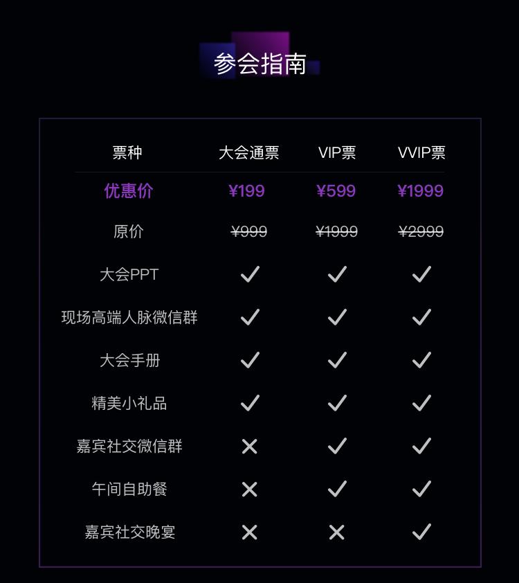 199¥领取大会通票,包含大会ppt、大会手册等基本项目,不包含嘉宾社交群、自助餐和晚宴。