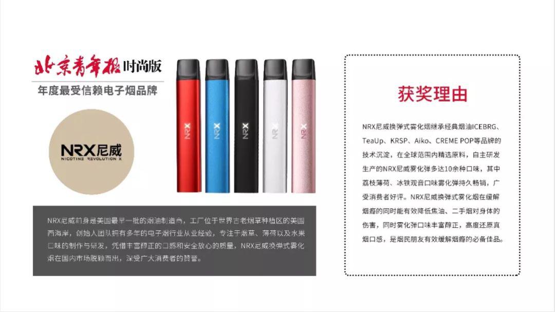另一方面,就像今年315晚会报道所说的,一些不合规的商家为了降低成本,采用伪劣的原料,同时自身也没有成熟的生产和研发能力,最终很容易就被市场所淘汰了。NRX尼威产品面世以来,在用户群体中保持着良好的口碑,2018年,品牌还被北京青年报评为“年度最受用户信赖电子烟品牌”。