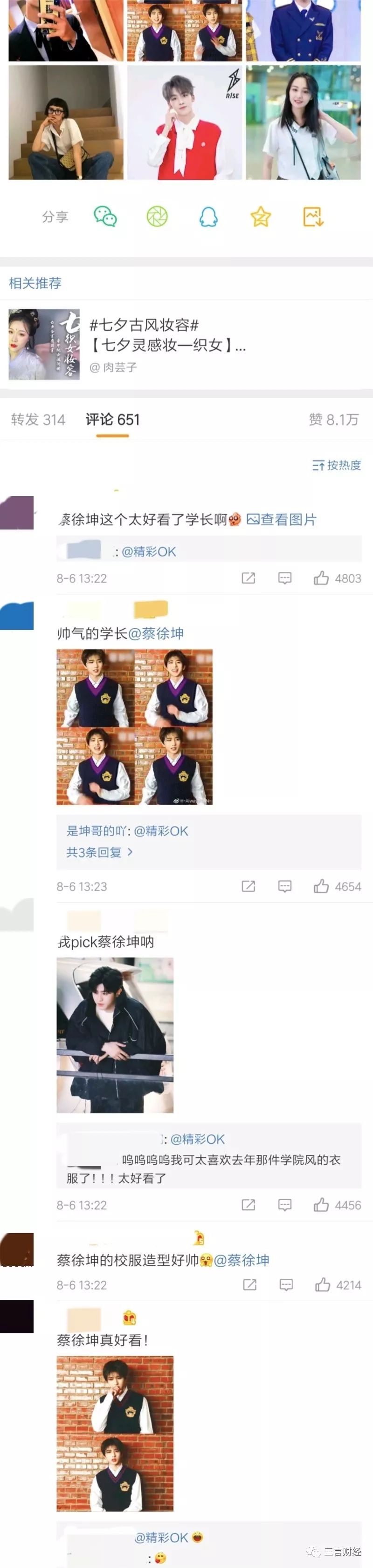 根据粉丝团发的链接,ikun们在大V的微博下安利蔡徐坤,把正面声音顶到最前面,控制评论走向,即所谓的“控评”。