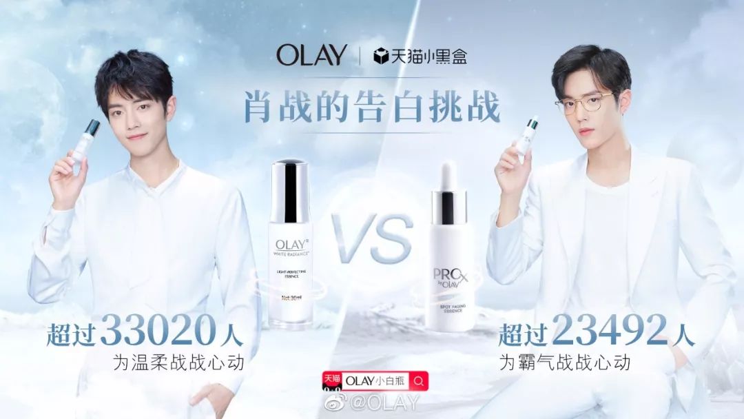 鉴于肖战是天秤座,olay策划了“双人肖战”宣传路线,配合肖战出道1000天的概念一起推广。这套设计还挺有新意的,也正好与olay主推的两款不同功能的小白瓶相得益彰,因而,#肖战的告白挑战#顺势生成,自己与自己battle,无论哪方获胜,品牌都能卖货。