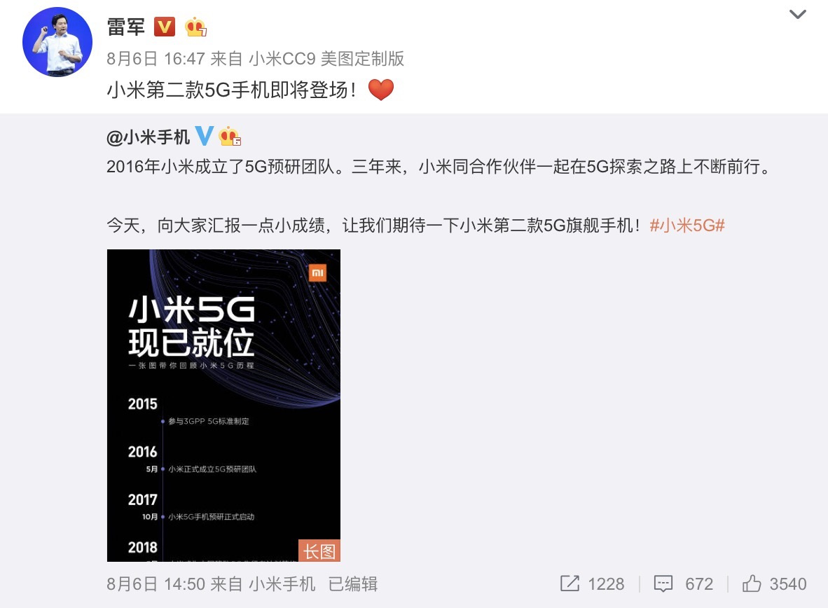 36氪获悉,8月6日,雷军在自己的微博上预告,小米的第二款5G手机即将登场,而在这之前,他们推出首款5G手机是小米MIX 3 5G版。