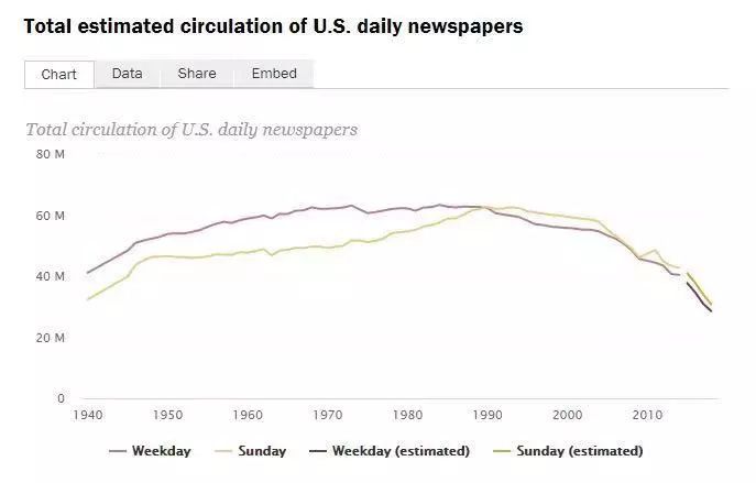第一步,高效管道淘汰低效管道,例如电视新闻、数字新闻的普及对传统报纸行业的冲击,据皮尤研究中心数据,2018年在美国报纸发行总量下降的同时,数字新闻依然实现了17%的增长。