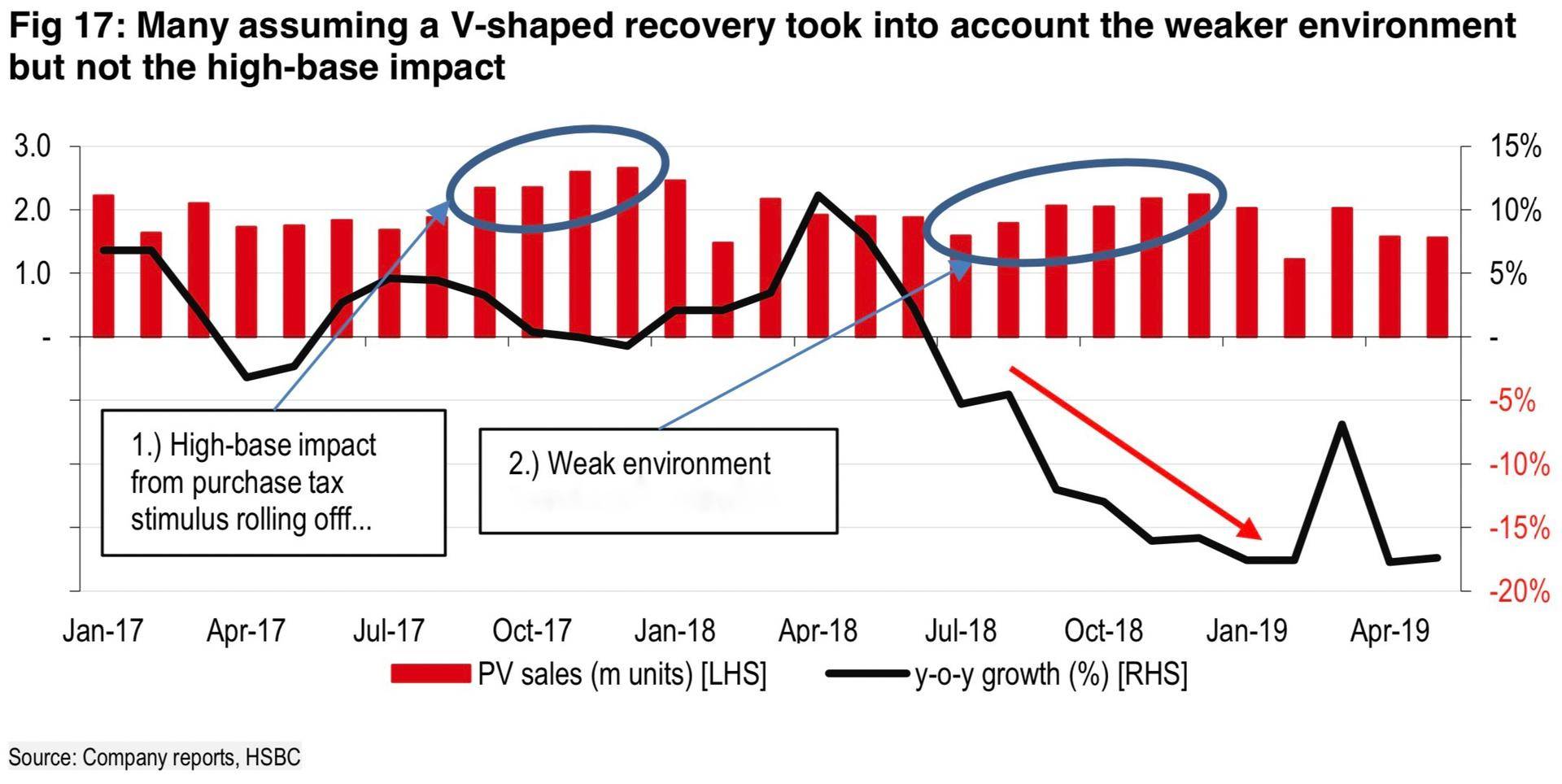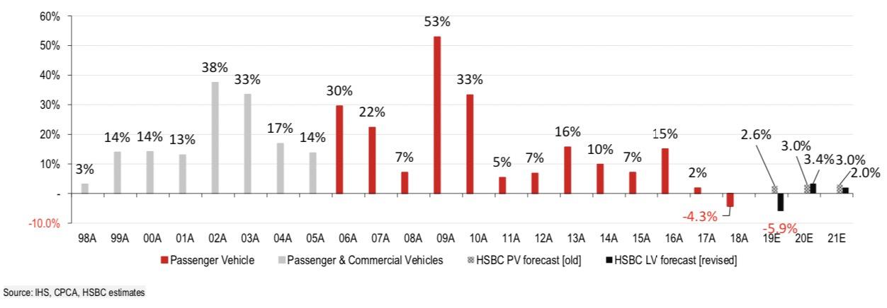 汇丰银行表示,随着双积分等新刺激措施出台,理应在2019年看到相较2018年更好的增长,但目前并未看到此迹象,所以对其增长趋势持悲观态度。