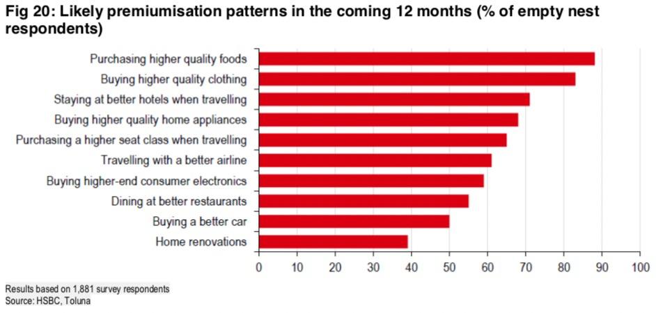 上文发现,当孩子离开家时,77%的空巢老人可支配收入增加,82%的人表示愿意购买质量更好的产品。但值得注意的是,汽车并没有购买意愿中占据很高的位置,因此汇丰认为靠消费需求不足以促使汽车销量在下半年强势反弹。