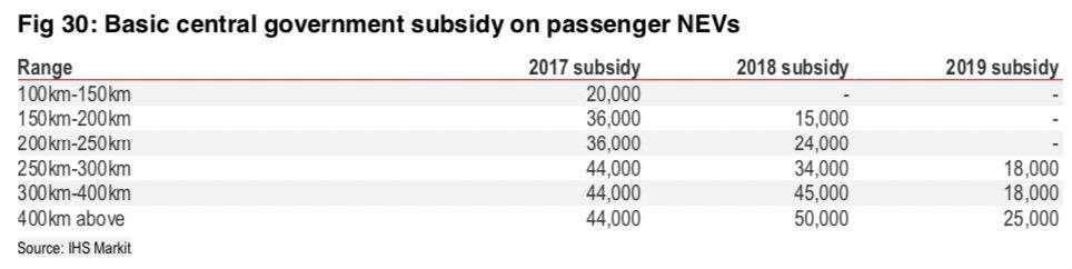 因补贴退坡,新能源车与燃油汽车较大的价格差距,将进一步降低消费欲望。目前政府对新能源汽车最高补贴为2.5万元人民币,较2018年补贴计划下降50%。