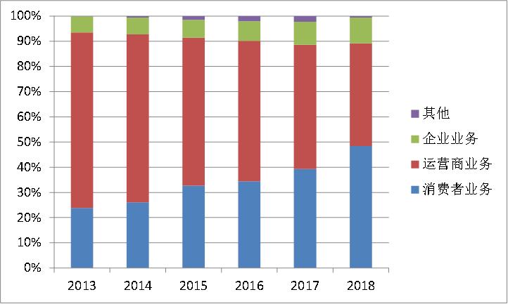再来细拆一下收入结构:根据2018年财报,华为消费者业务占比48%(首次超过运营商业务成为公司最大的营收来源),此前最大的运营商业务占比下降为41%,这两大业务成为华为的支柱收入来源。