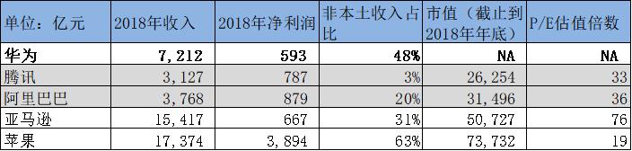 如果与美国的科技巨头亚马逊与苹果对比,华为目前体量仍不算大。