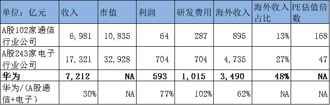 (1)华为与A股整体通信和电子上市公司对比;