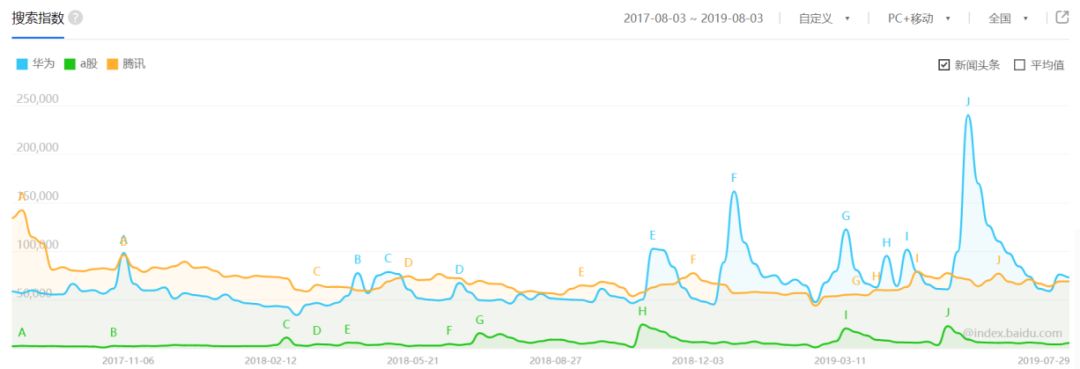 以2017年8月至2019年8月两年内的百度指数为例:在2018年11月份以前,华为基本上和深圳另外一家互联网巨头腾讯(HK:00700)的关注度不相上下;