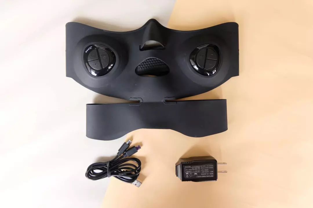雅萌的这款吃鸡面罩构造很简单——两个EMS(微电流)电极,一个硅胶制的面罩,还有一个可一次性充两个电极的充电器。