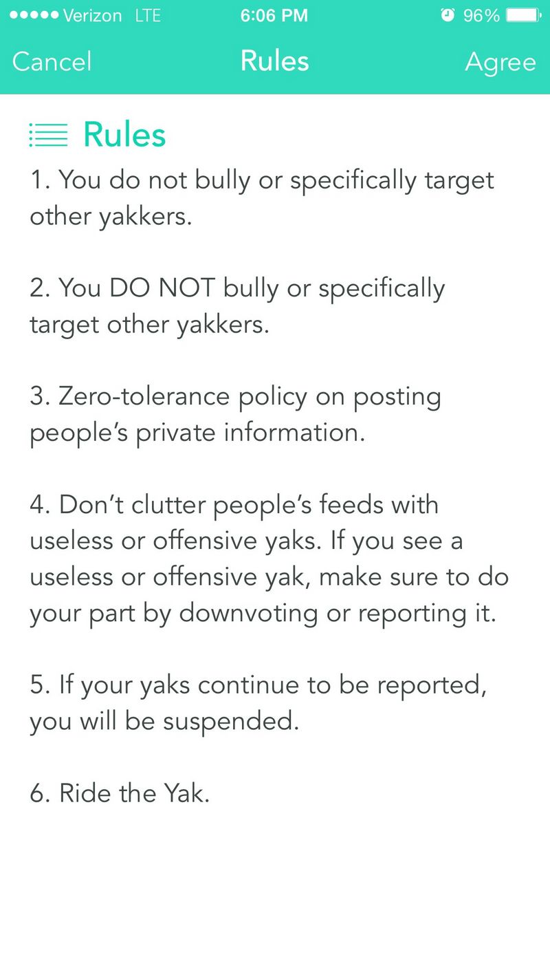 Droll与Buffington以近乎疯狂的方式来杜绝霸凌现象,不仅设立了严格的社区规则,更是在全国所有的高中地区设立地理位置栅栏,禁止高中学生使用。这对当时用户群体主要分布在高中和大学的Yik Yak来说无异于自断一臂。