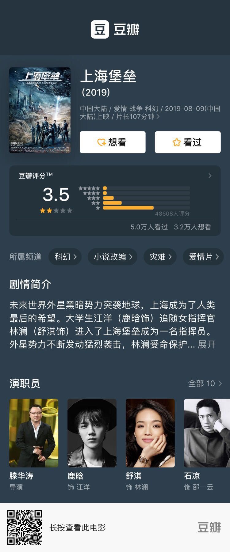 8月9日上午豆瓣评分3.9分,其后一路走低,截止到文娱商业观察8月9日晚发稿之前,《上海堡垒》的豆瓣评分已经下跌到3.5分,猫眼评分下滑到6.9分,淘票票6.5分。