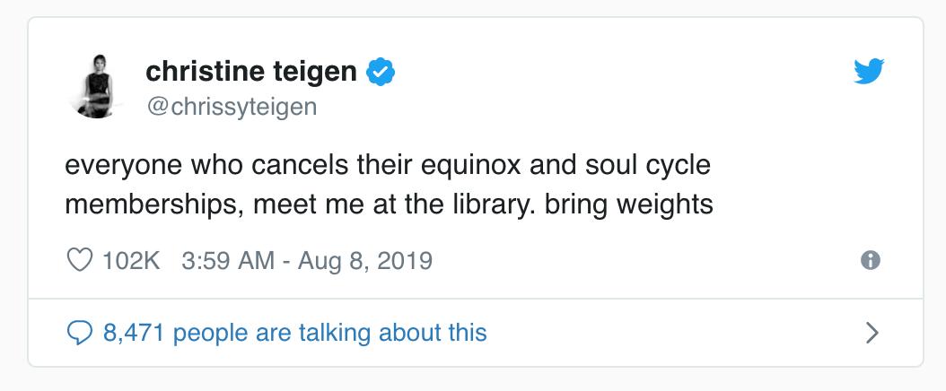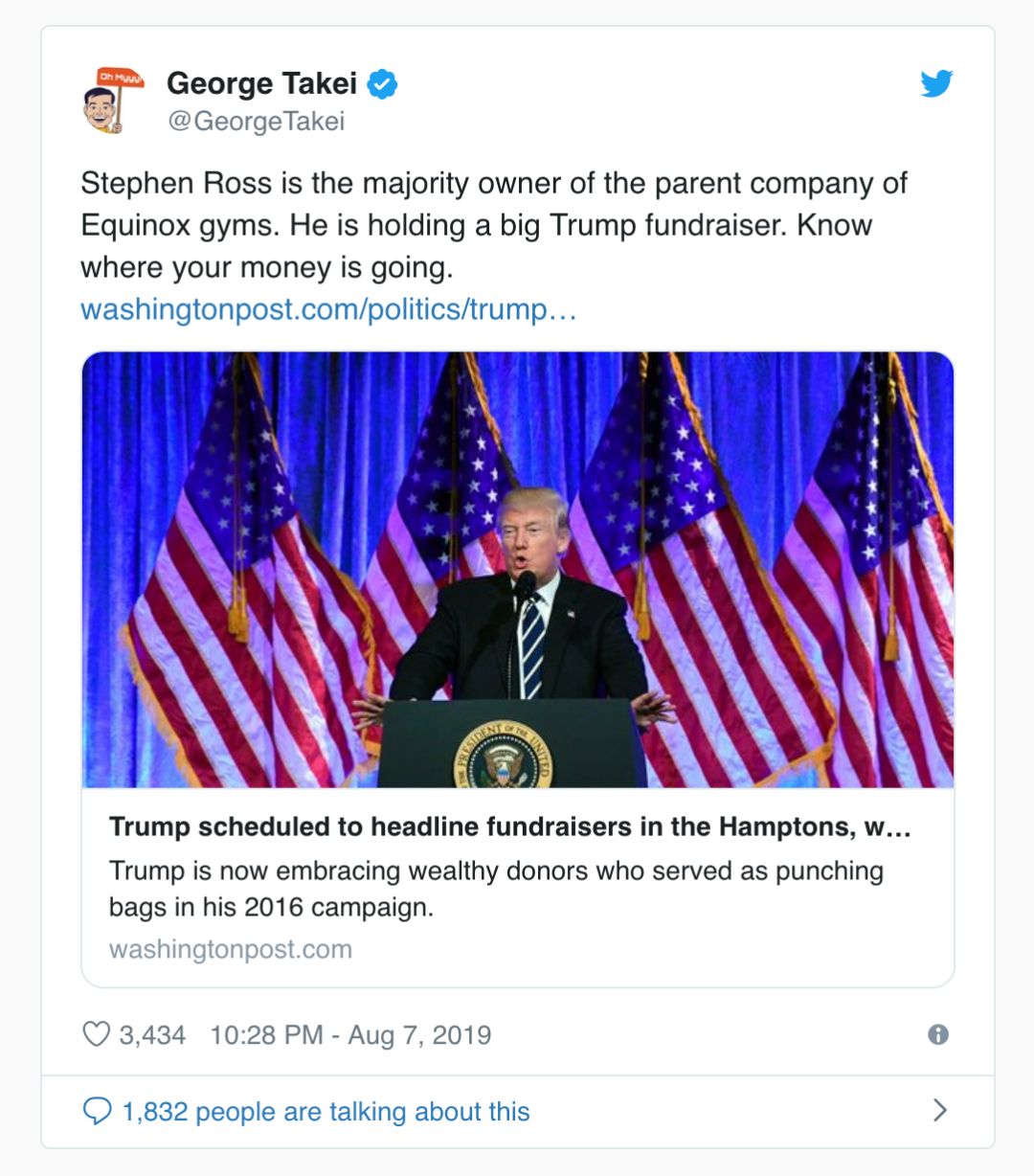 比如粉丝过千万的美国著名模特Chrissy Teigen,和著名演员乔治·竹井等,发Twitter呼吁申请取消Equinox和SoulCycle的会员。目前Chrissy Teigen的Twitter点赞量已经超过10万,相关的话题也在持续发酵。