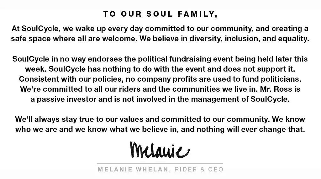 Equinox和SoulCycle官方随后发布公告,称斯蒂芬·罗斯仅为被动投资人,不参与公司的具体经营管理。SoulCycle CEO Melanie Whelan 发布对LGBT群体的包容和族裔群体的尊重。