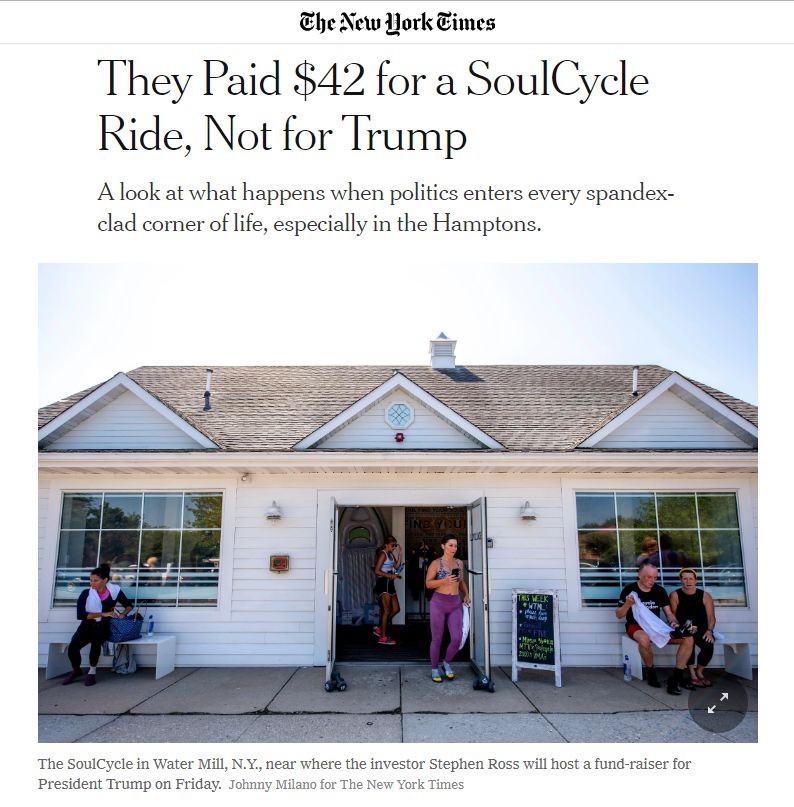 纽约时报以标题为「他们花42美元来骑SoulCycle,而不是给特朗普」,对北京时间周六,即将在SoulCycle纽约汉普斯顿门店附近的筹款活动进行了抨击。