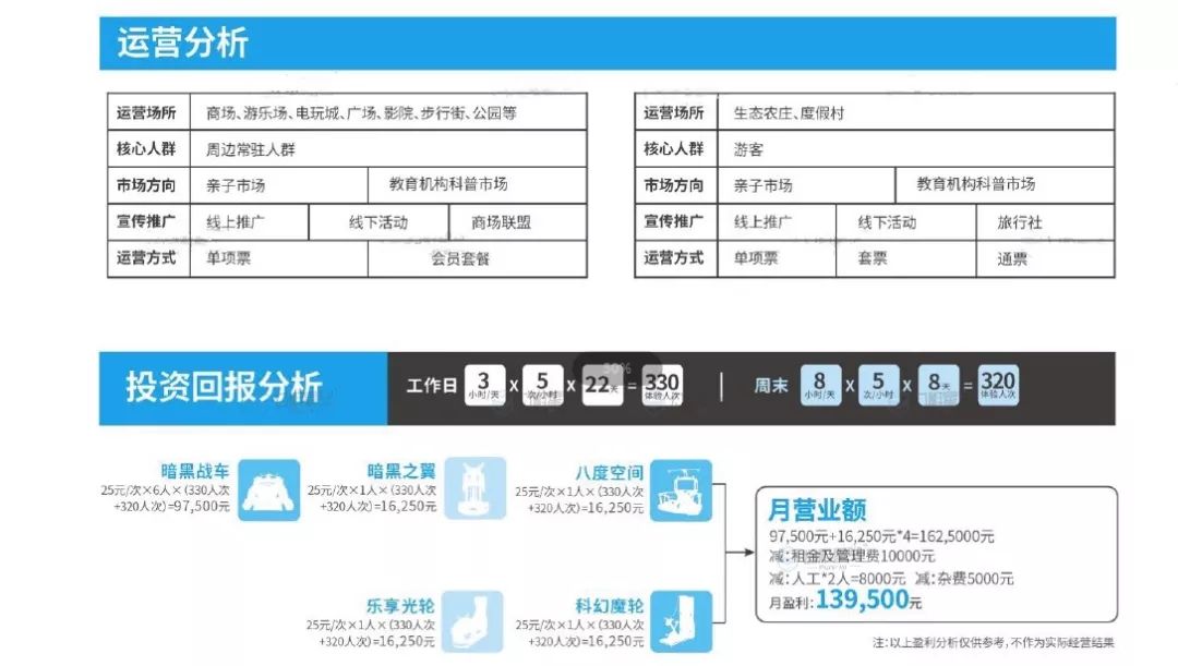 随后,该业务经理将一份名为《VR娱乐盈利方案》的PPT发送给记者,从上面看出,他们提供的方案分为10万+、30万+、60万+和80万+四大类。其中还标明了每套方案的月营业额分别在57000元、139500元、239250元和335000元。